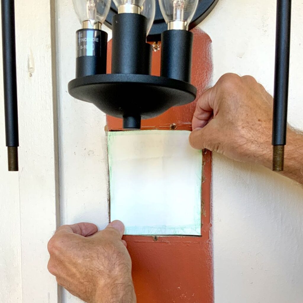 This “little” surprise measured 4.25 x 5.3-inches. Too big to just mud over. Typical sheetrock mesh would show. We could hang a sign over it and call it a day . . . . but really? that seemed rather lame and what sign would fit between the battens and behind the new light fixture and look good.